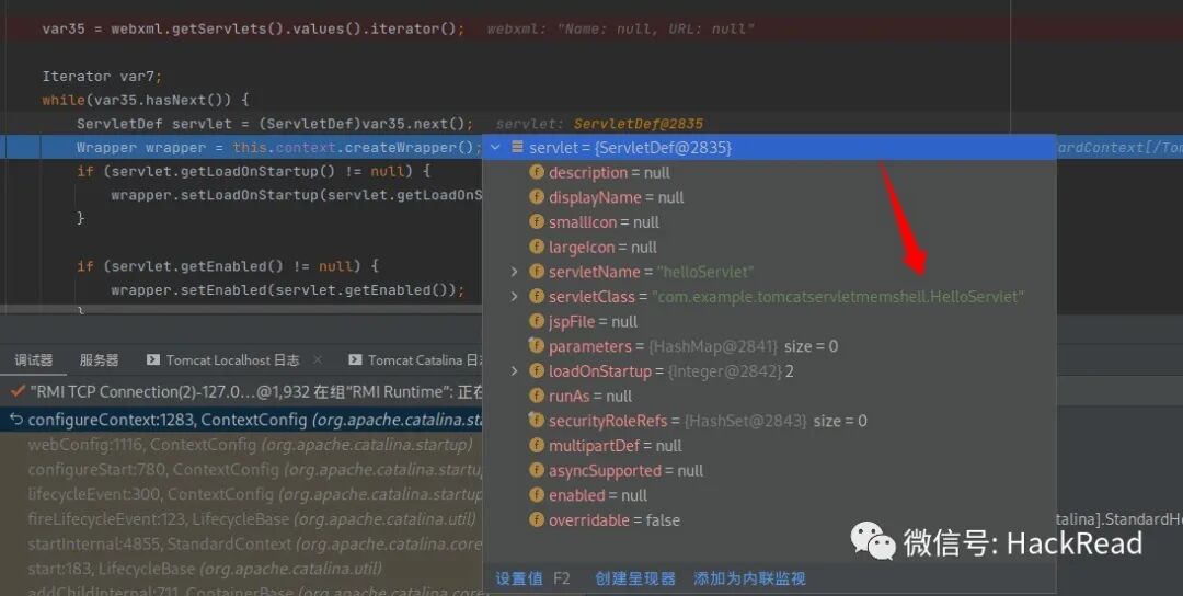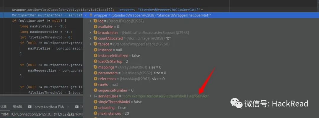 可以看到此处将Wrapper的servletClass设置为HelloServlet的全限定名。继续跟进,因为Servlet的multipartDef==null、asyncSupported==null,因此以下部分我们可以跳过: