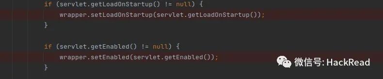 首先获取Servlet的LoadOnStartup和enabled,并设置给Wrapper。其中LoadOnStartup就是我们在注解中配置的参数,它表示servlet被加载的先后顺序。继续跟进: