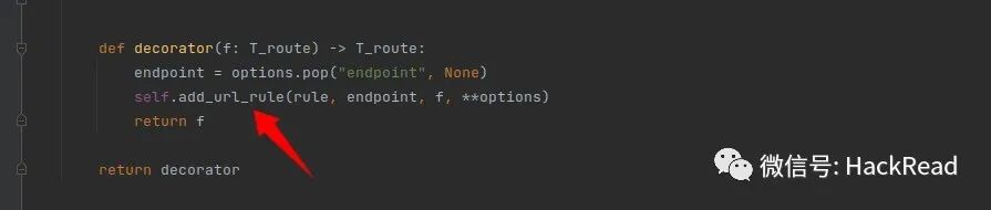 跟进装饰器@app.route('<url>')的代码,可以看到其本质上也调用了flask对象的add_url_rule()方法: