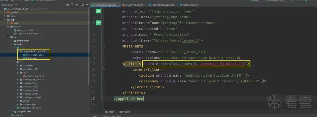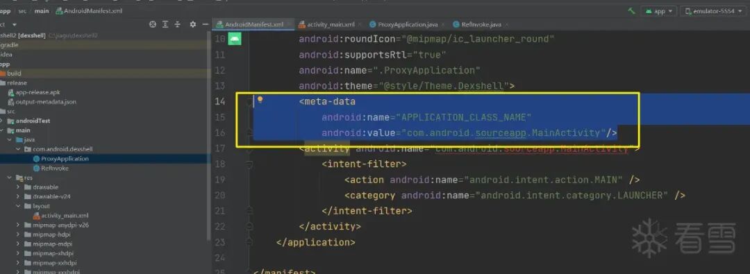 2、解壳app的androidmanifest.xml增加一个描述信息,用于在动态运行的时候,将壳的application替换为源app的application,完成app的正常启动。