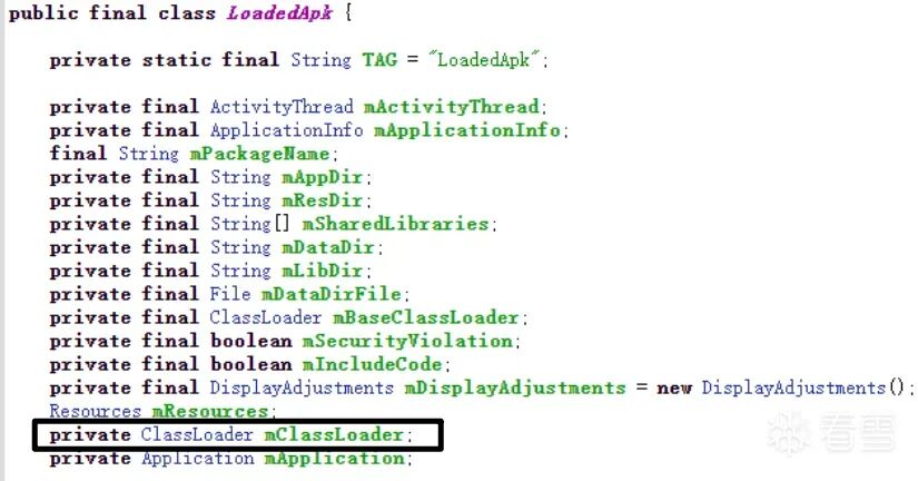 我们使用dexclassloader来加载我们的apk,为了让加载的apk有自己的启动流程和生命周期,将我们的dexclassloader替换LoadedApk中的mClassLoader这个字段。
