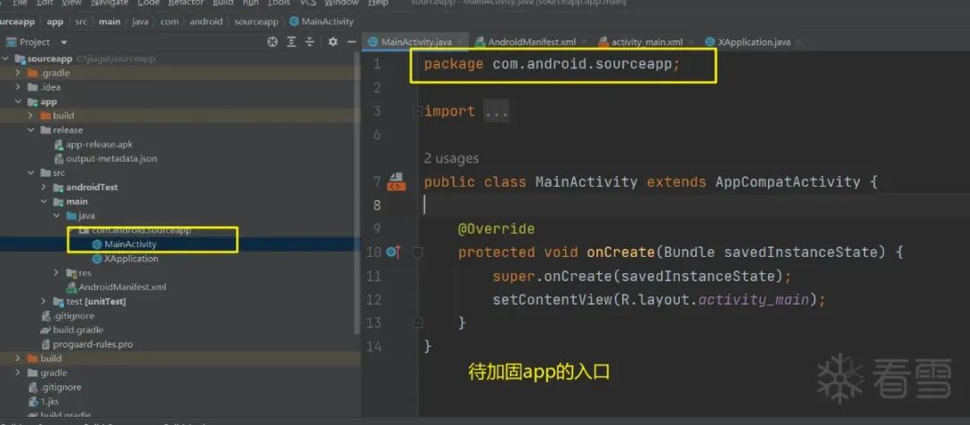 这其实导致了我失败很多次,我一直都没搞明白,这个com.android.sourceapp.XApplication 指的是源app的Activity还是壳的Activity,经过修改总是失败,最后在大佬的帮助下才明白,这个是源app的一个类。