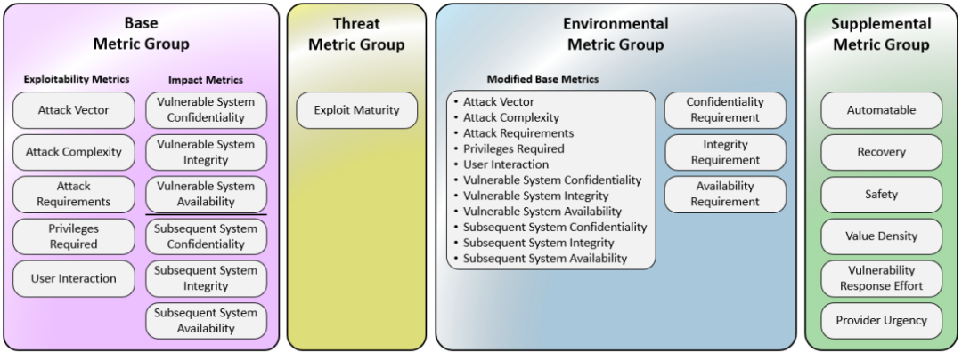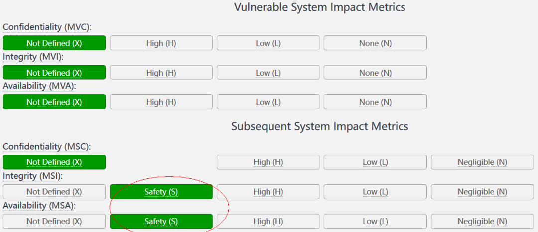 安全指标值衡量漏洞利用后对人类参与者的安全性,或可以预见受伤的参与者的影响。与其他影响指标值不同,安全性只能与后续系统影响集关联,除了可用性和完整性指标的 N/L/H 影响值之外,还应考虑安全性。
