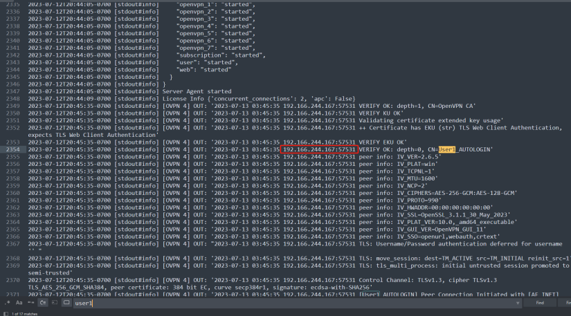 在openvpnas.log中搜索user1