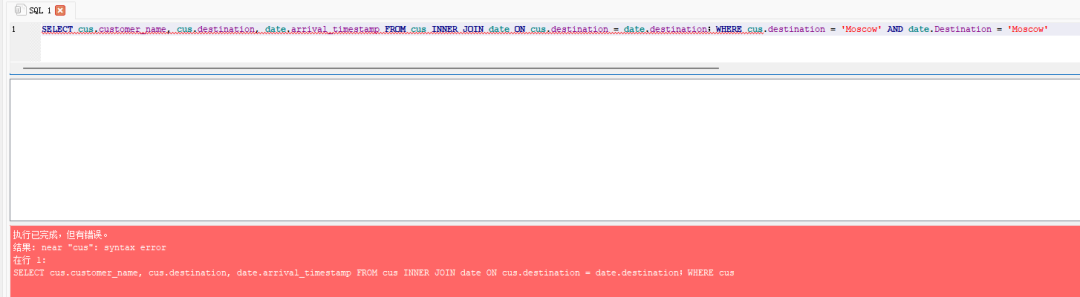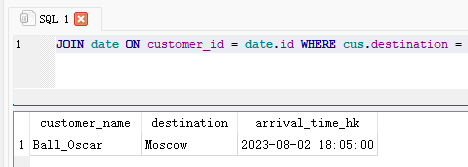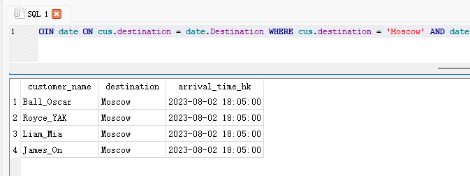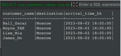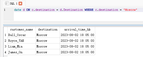 A. SELECT c.customer_name, c.destination, datetime(d.arrival_timestamp_HK, 'unixepoch', 'localtime') AS arrival_time_hk FROM cus c INNER JOIN date d ON c.destination = d.Destination WHERE c.destination = 'Moscow'B. SELECT cus.customer_name, cus.destination, datetime(date.arrival_timestamp_HK, 'unixepoch', 'localtime') AS arrival_time_hk FROM cus INNER JOIN date ON customer_id = date.id WHERE cus.destination = 'Moscow' AND date.Destination = 'Moscow' AND date.arrival_timestamp_HK IS NOT NULL AND datetime(date.arrival_timestamp_HK, 'unixepoch', 'localtime')C. SELECT cus.customer_name, cus.destination, date.arrival_timestamp FROM cus INNER JOIN date ON cus.destination = date.destination;WHERE cus.destination = 'Moscow' AND date.Destination = 'Moscow'D. SELECT cus.customer_name, cus.destination, datetime(date.arrival_timestamp_HK, 'unixepoch', 'localtime') AS arrival_time_hk FROM cus INNER JOIN date ON cus.destination = date.Destination WHERE cus.destination = 'Moscow' AND date.Destination = 'Moscow' AND date.arrival_timestamp_HK IS NOT NULL AND datetime(date.arrival_timestamp_HK, 'unixepoch', 'localtime')