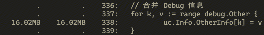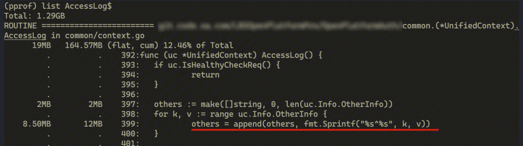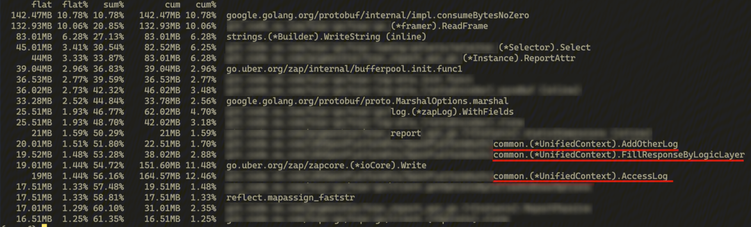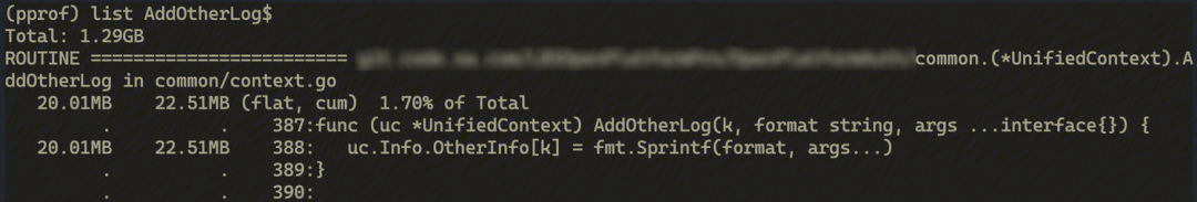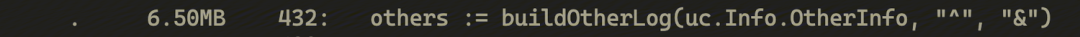 首先看第一个函数 AddOtherLog。这个函数的作用是向上下文中添加一些额外的日志信息,最后打日志的时候会输出到最后一个字段中,一般用于输出一些执行过程中的辅助信息,供排查问题使用。这个函数的定义很简单,我们输入 list AddOtherLog$ 看一下:可以看到这函数就一行,就是往 OtherInfo 这个 Map 里添加一条记录。第二个函数中的问题其实也和 OtherInfo 有关,也 list FillResponseByLogicLayer$ 看看(只截取相关部分):看到这里自然就想到,往 Map 里插入数据,如果 Map 本身空间足够,是不需要重新申请内存的,这里申请了内存必然是因为初始化的时候忘记设置 cap 了,再一看创建 UnifiedContext 对象的代码,果然:把这里改成提供 20 的 cap 之后,AddOtherLog 等函数操作 Map 时果然按预期不再申请内存。Note:这个优化其实对内存分配和 GC 影响很小。因为无论如何储存 20 个 KV 需要的内存总是要申请的,这个改动区别只是在于在初始化的时候申请还是在插入时因为空间不足而申请。而且 Golang 的 Map,KV 是储存在 bucket 里,一个 bucket 存在 8 个 slot,所以在量很小时,实际上最后申请的内存空间差不多。但这依然是个优化,因为 Map 每次增长都需要重算 hash,但一开始设置好容量就可以避免这部分 CPU 占用。 3.3.2 字符串处理