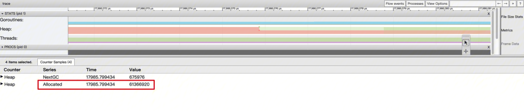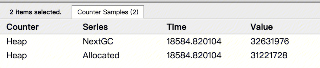 我们重新看这张图,这里除了 Allocated 已分配堆内存大小这一项之外,还有一项叫做 NextGC,直觉告诉我们这个值貌似和 GC 频率有关。查看 Runtime trace 的相关资料,了解到 Heap 图表的红色部分代表占用内存,而绿色部分的上边沿表示下次 GC 的目标内存, 也就是绿色部分用完之后,就会触发 GC。通过查看一个刚刚 GC 完毕的 trace 点的信息:可以发现,每轮 GC 我们只有大约 30M 内存可以用,(快)用完了就触发 GC,就是这个限制造成了特别高的 GC 频率。其实在 metrics 中也有 NextGC 的相关上报;但是和 Trace 里显示剩余空间不同的是,metrics 上报的 NextGC 是 MemStat 结构里的原始值,也就是当 Heap 达到多少的时候触发 GC,更加清晰的能发现 Heap 上限就是 60MB 左右。 4.2 GOGC 参数