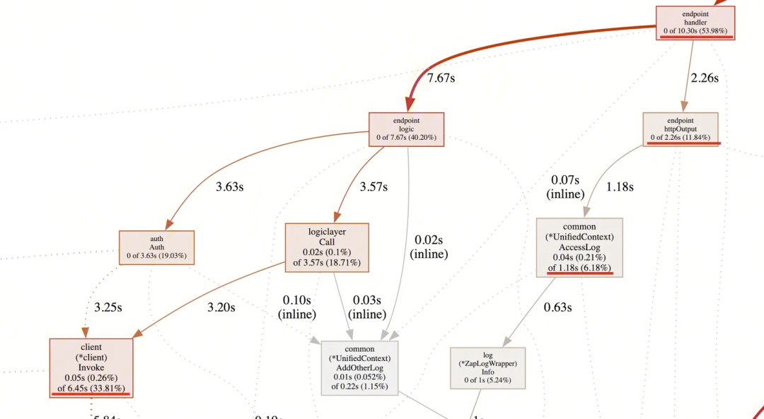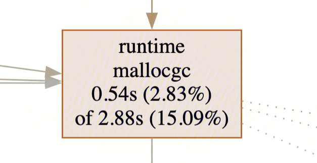 这个命令用于进行 30s 的 CPU 性能分析,在完成之后会进入 profile 的交互工具:这里直接输入 top 10 可以输出 flat 占比最高的 10 个函数,可以看到 runtime.mallocgc 的 cum 占比已经达到了 15%,占用了快到 3s CPU 时间。Flat 占比是指这个函数自身的代码使用了多少 CPU,不计算子函数的耗时。而 Cum 则代表这个函数实际执行消耗了多少 CPU,也就是包括了所有的子函数(和子函数的子函数...)的耗时。交互工具这里输入 web 就会自动生成调用图(callgraph)并在浏览器里打开 ,限于文档空间这里只展示重要的部分 :先分析一下主流程,这里业务逻辑一共占用了 54% 左右的 CPU(最上面的 endpoint.handler 方法),再往下看,其中 33% 是 RPC 调用(左下角的 client.Invoke),12% 是结果输出(右边的 endpoint.httpOutput,包括写出 HTTP Response,日志上报,监控)。剩下 9% 左右就是实际的各种业务逻辑了,因为非常分散且没有集中的点,所以图上没有显示出来。纵观这个图可以看出,除了 HTTP/RPC 网络调用占用了大部分 CPU 外,并没有其他很明显的 CPU 热点,这就让最后一个热点凸显了出来:GC 占用的 CPU 在这次 Profiling 过程中占了 15%,比业务逻辑还高!到这里基本确认,GC 一定存在某些问题。 3.3 内存分配