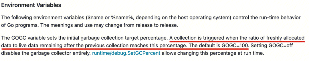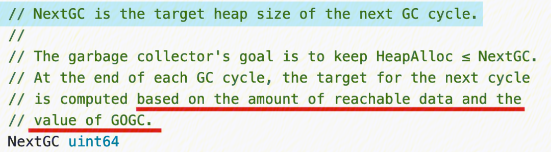 那么是什么在控制 NextGC 的大小呢,顺着线索我们来到 NextGC 这个值的注释:这个值是在上一轮 GC 结束时,基于可达数据和 GOGC 参数计算出来的。可达数据,可以理解为 GC 过程当中从 root set 出发,沿着指针可以到达的数据,其实也就是还在使用,不能被 GC 的数据。它的功能是控制 GC 的触发:会在每次新申请的内存大小和上次 GC 之后 Live Data(就是上面说过的不能被 GC 的数据) 的大小的比值达到 GOGC 设定的百分比时触发一次 GC。可能有点绕,写成公式其实就是 NextGC = LiveData * (1 + GOGC / 100)。而默认值是 100 就表示,在每次 GC 之后,内存使用量一旦翻倍,就会再触发一次 GC。很明显,这个默认值就是触发频繁 GC 的罪魁祸首。问题找到之后解决方案就很简单了,把 GOGC 调大就行了。但是因为 GOGC 是个环境变量,如果写死在 Dockerfile 里如果想修改还需要发布上线,不是很灵活。不过上面的文档也提到了,可以用 SetGCPercent 在运行时修改这个策略参数。 5.1 SetGCPercent