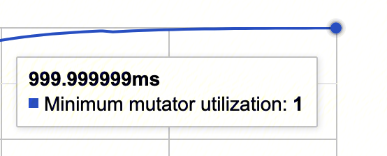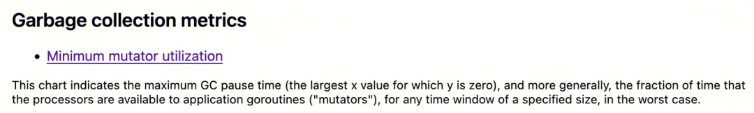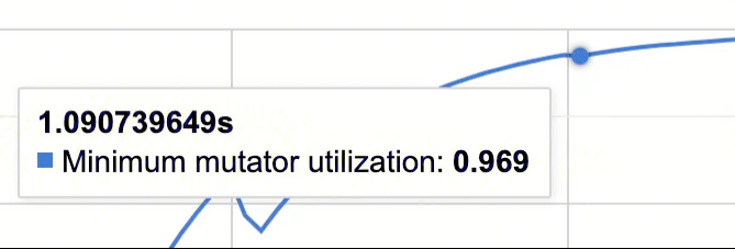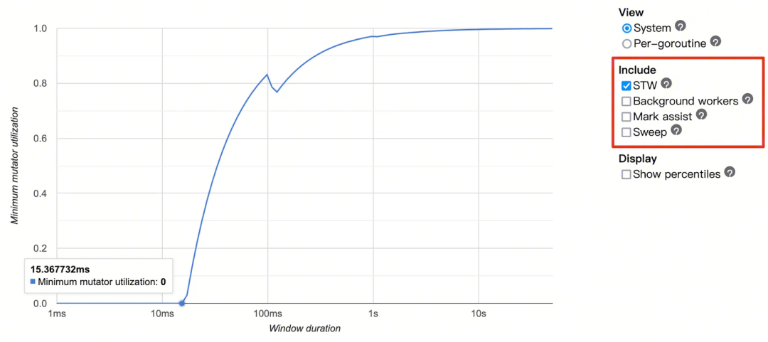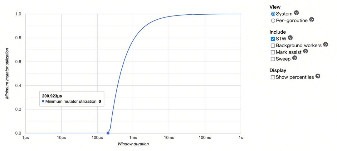 这里我们一眼就看出一个很特别的图案:Heap 堆内存呈现很明显的锯齿状。而且 GC 也在每次下降沿出现,很明显,这就是 GC 在不停的回收内存。才 550ms,而且通过点击堆内存的最高点,查看统计可以发现:我们内存的最高点,应用程序自身才使用了 60MB 左右的堆内存。总结一下,也就是说:现在我们的程序占用的内存非常小,但是 GC 却特别频繁,甚至达到了一秒两次。然后我们回到 trace 首页,找到最底下的 MMU 链接:点进去可以看见一个图表,因为我们只关注影响程序执行的 STW 阶段,所以右边只勾选 STW:- Y 轴表示这个时间窗口里,最差情况下有多少比例的 CPU 时间可供业务代码使用。