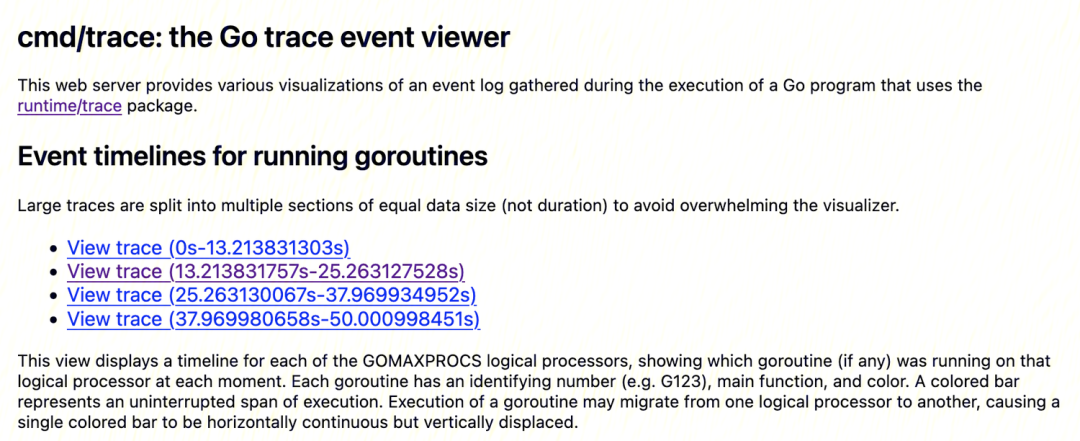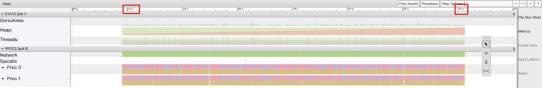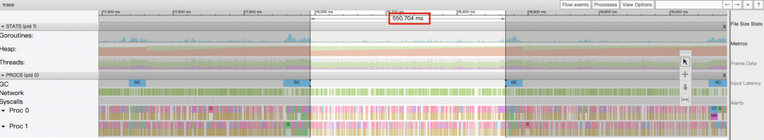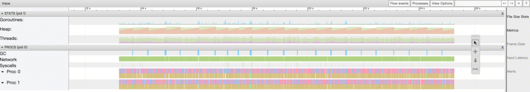 这里进行了 50s 的 trace,然后使用 golang 的 trace 工具解析结果,并在浏览器中可视化:- Processor 事件:显示执行器在执行哪个协程和函数。