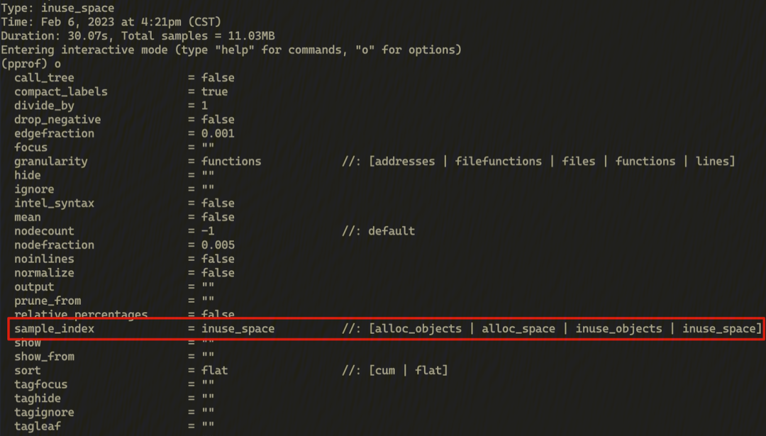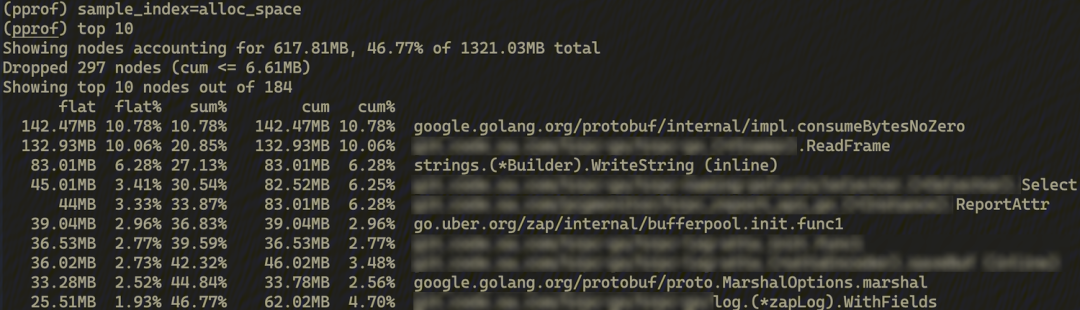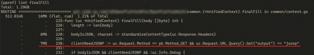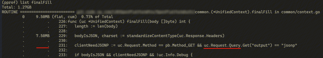 和 CPU Profile 不一样,Allocs 的 Profile 会记录四个不同的信息,可以输入 o 查看 sample_index 的可选值:一般来说,inuse 相关的记录可以用于排查内存泄漏,OOM 等问题。这里我们是 GC 的问题,主要和内存申请和释放有关,所以先看下 alloc_space:输入命令,sample_index=alloc_space,然后再 top 10 看下:可以发现,这 30s 一共申请了 1300M 的内存,其中绝大多数都是框架和框架组件,比如 RPC 的网络读取(consumeBytes, ReadFrame),pb 的解析和序列化(marshal),名字服务的选址(Select),日志输出(log),监控上报(ReportAttr)。也没有明显的可疑对象。我们进行一些简单计算:进行 profiling 的线上节点是 2C2G 配置,看监控单节点大约是 800 QPS 的流量,所以 30s 就是 2w4 的请求,申请了 1300M 的空间,平均一个请求就是大约 50KB 左右。这个量也比较合理,毕竟一次请求我们需要储存 HTTP 包内容,解析成结构体,还需要调用两次 RPC 接口,最后做日志写出和监控上报,最后再给出返回值,50KB 的资源使用并不算大。而且绝大多数都是框架使用,即使用对象池把业务上的一些小对象复用,对这个内存申请也影响不大。虽然这个步骤没有排查到想查的问题,但是却发现了一些其他的代码中的小问题,这里也顺便记录下。首先,上面的 top 10 看不出任何问题,但是为了保险起见,看了一下 top 20:这里有三个我们业务代码里的函数,flat 都很少,占比加起来也不到 4.5%,不过既然发现了他们 ,就深入看一下函数里各行的分配情况,看看有没有什么问题。 3.3.1 预分配空间