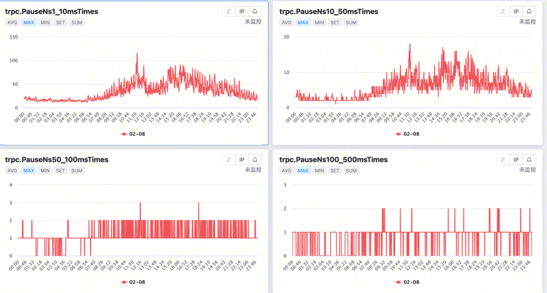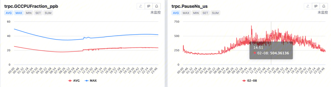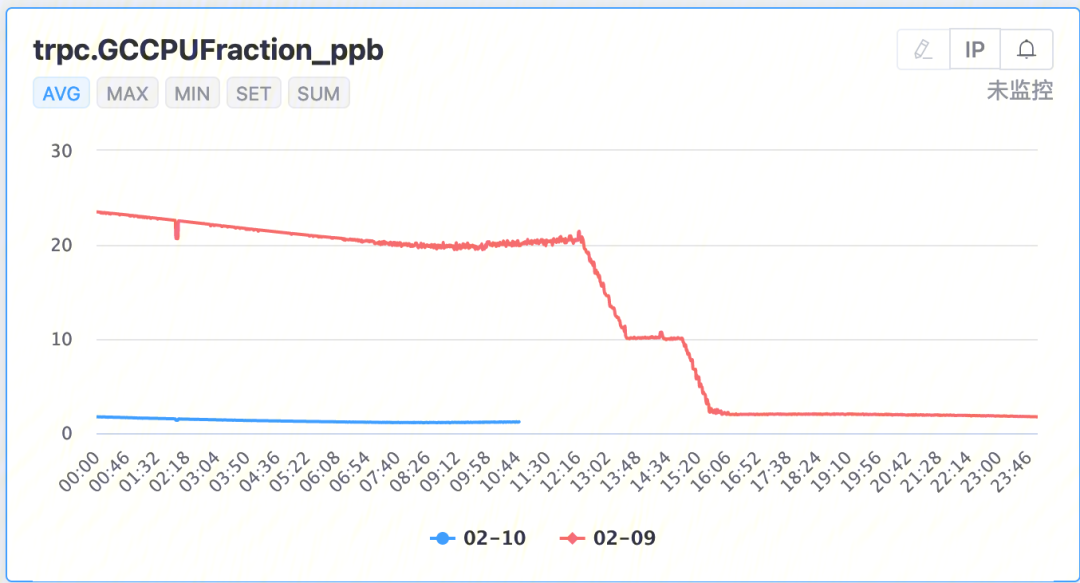 最后增加上 Memory Limit 的配置,就是我们的最终解决方案。理论上问题都解决了,Metrics 上看 GC 占比也下来了,那自然要全量上线看看效果:这张图就是文档写到这里的时候,刚刚去截的客户端主动断连监控,对比的是 2 月 9 号,优化上线之前。可以看到客户端(认为请求超时)断开链接的数量明显比之前下降明显,整体曲线也更加平稳,毛刺更少。PS:当然客户端断连不可能完全消失,必然存在一些请求确实是达不到客户端的超时要求本文档介绍了从发现到解决这个 Golang GC 问题的过程当中,排查问题的思路,观察的重要监控指标和含义,使用的调试工具和方法。虽然最后只是用了两个简单的函数来解决问题,但上述资料对其他类型的问题排查也有一定价值,故记录下来。单独看这个问题,因为 Web 类应用大多不存在很大量的全局数据,所以配合上 GOGC 的默认值 100,很多高 QPS 的在线服务可能都会存在 GC 过于频繁,没有利用上申请的 Pod 内存的问题。不过因为 Golang 的 GC 流程也越来越并行化,STW 几乎只会影响极端情况,带来的最多是毛刺而不是服务的整体性问题,所以这个问题可能大多数情况下都被忽略了。但如果线上存在单节点流量比较大且内存申请几乎完全只与请求量有关,又对极端情况下的耗时有较高要求的服务,可以酌情调整下 GOGC 参数,降低 GC 消耗,提高稳定性。