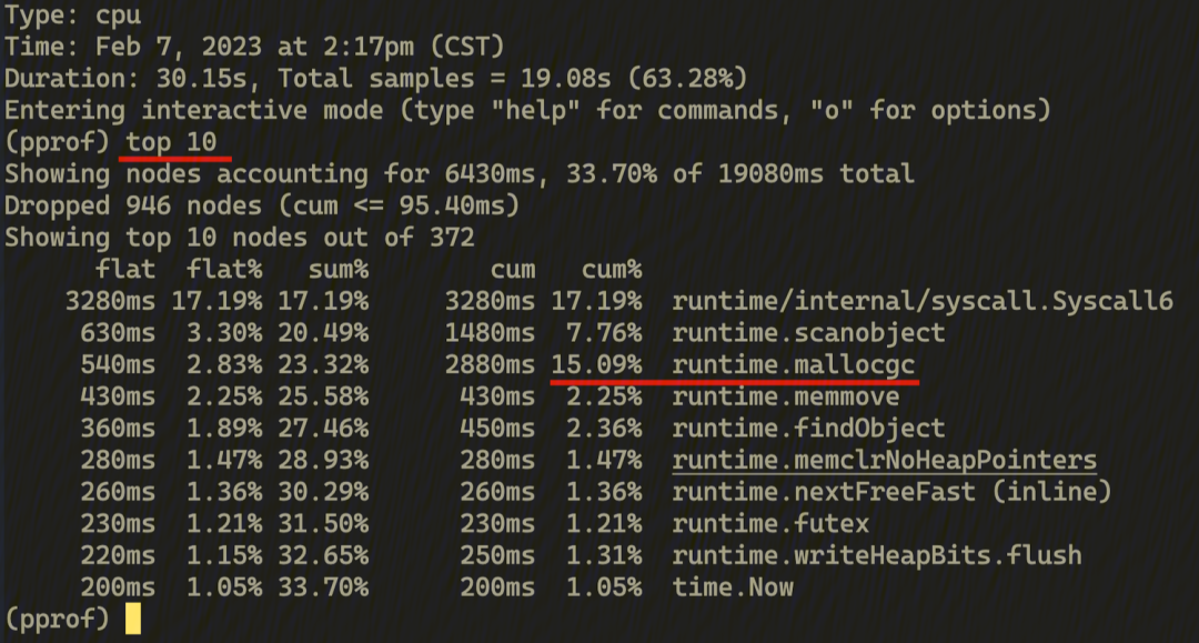 既然问题是 GC 占用的 CPU 过高,首先我们分析一下 CPU 热点,进一步确认一下问题。go tool pprof -seconds 30 https://<测试域名>/debug/pprof/profile