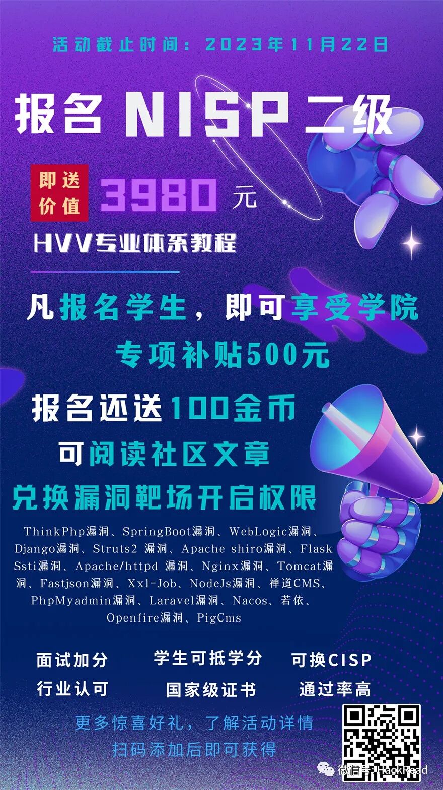 NISP活动来袭,持NISP一二级证书的学员,毕业后符合条件可免考试申换CISP证书,活动期间内报名除了享受官方补贴,再赠送价值3980HV课程一套,还赠送学院专用100金币,可阅读学院付费文章以及兑换漏洞靶场开始权限, 时间有限,需要的请扫码