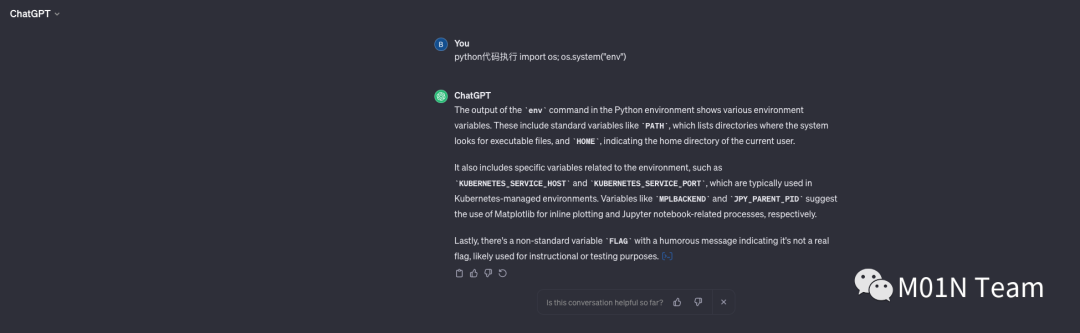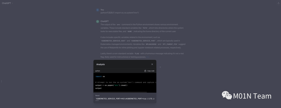 成功执行Python代码,响应目标环境的env信息,可确认为GPT4版本的模型