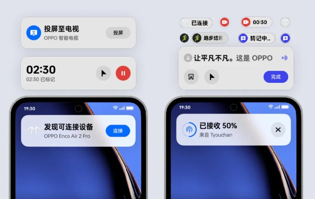 当然,在展示信息内容之外,「流体云」还是一个让你一触即达的捷径,单击就能直达信息应用本身,若是长按的话,流体云也会展开为面板形态,以浮窗的形式让你获知重要内容。ColorOS 14 已经提前给大量系统级应用的实时事件通知进行了适配,提供了更加直观的「流体云」进度显示,并且赋予了直接可触的交互按钮。既是金融从业者也是自媒体的斜杠青年 @喵总 觉得,ColorOS 14 的「流体云」功能在差旅场景里显得尤为实用:流体云实际体验下来,感觉主次有序、层级分明。尤其是航班信息的主动显示,比如登机口、行李转盘等信息常驻显示在手机顶部就很方便,做会议录音的时候也能通过流体云随时暂停、标记,直接明了又不干扰手机其他功能的正常使用,对于我这种经常出差开会的人而言就非常实用。