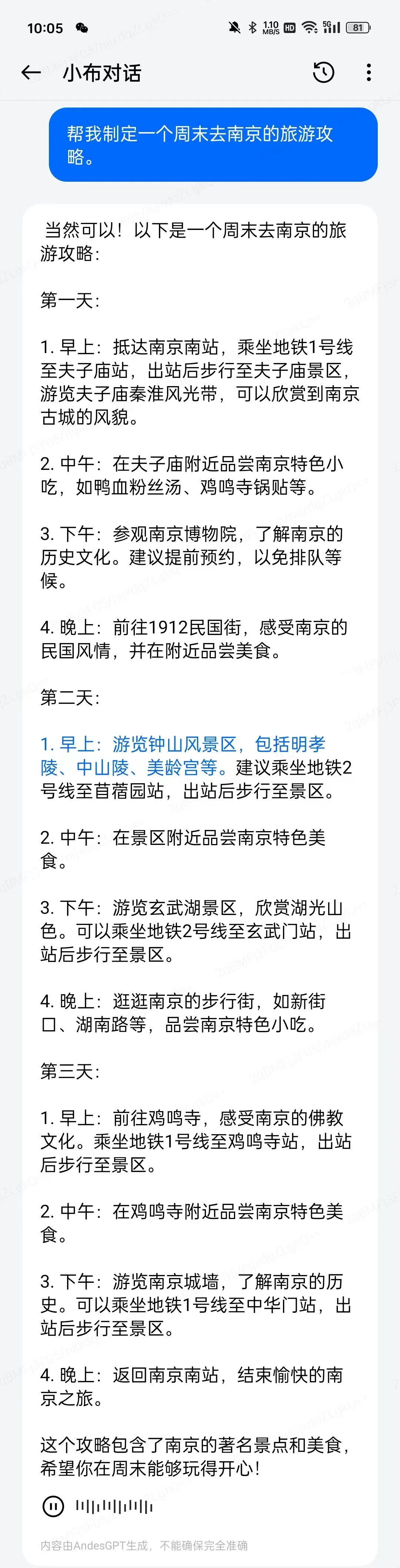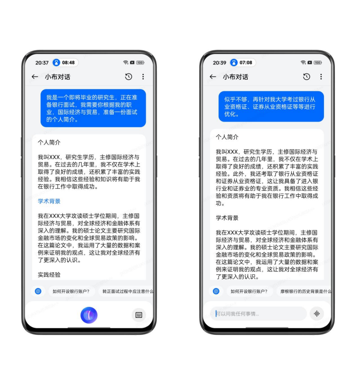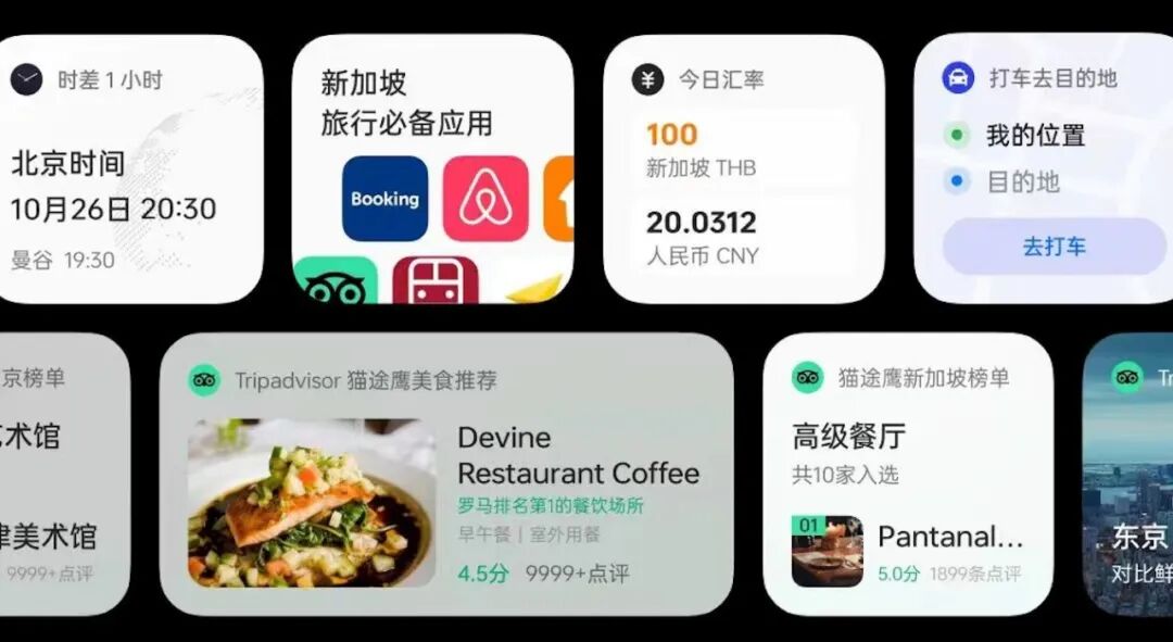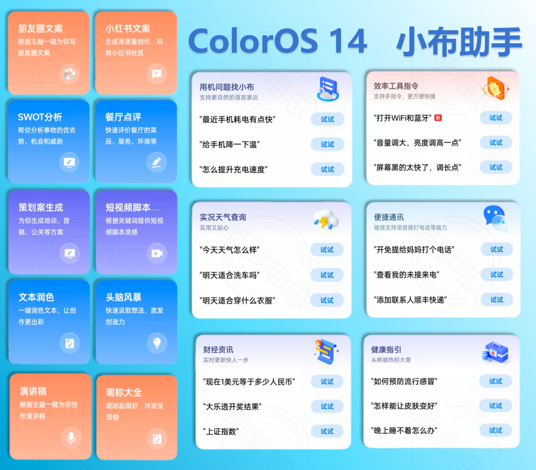 流体云让跨端服务推送更加有序,交互更加符合用户直觉。得益于潘塔纳尔系列的全新自适应交互框架,这项技术支持模板化代码编写和响应式布局,能助力三方应用快速完成多形态(图标、胶囊、卡片)、多交互形式(语音、流体云、车机)的适配开发。我们也期待越来越多的三方应用,可以快速适配「流体云」交互。今年,人们出门旅游的热潮不断升温,据文旅部数据统计,2023 年前三季度,国内旅游总人次 36.74 亿,同比增长 75.5%;2023 年上半年,全国移民管理机构共查验出入境人员 1.68 亿人次,同比增长 169.6%。所以在服务体验上,ColorOS 的泛在服务也顺应出行需求的日益增长而获得了整合升级,在高铁出行、航班出行、地铁通勤的基础上,增加了「一站式出游」的智慧体验。ColorOS 14 通过地理围栏以及用户意图的学习,能够识别用户购买了机票/火车票/景点门票,或者用户不是在常驻城市,而是在其他城市的情况,此时 ColorOS14 会在用户授权的情况下,主动感知用户位置,给用户主动智能推送城市游玩榜单卡片。用户点击相关卡片就能浏览旅游地知名景点、美食以及其他一些好玩好逛的地方,还能根据地点位置推荐相关酒店住宿等信息,省去繁琐地查攻略的步骤。若是在境外差旅,ColorOS 14 在识别到用户抵达境外的时候,会及时推送境外上网的服务,还会推送时差提醒、汇率提醒,让用户及时了解时差变化,以及汇率变动。面对境外语言交流可能会出现的阻滞情况,ColorOS 14 还会在桌面常驻放置「翻译」服务,用户在手机桌面的「小布建议」里可以一键进入,从容地应对打车、点餐等境外沟通情景。当然,相关的本地出行、旅游推荐服务都会适时主动呈现,境外热门 App 也会主动推荐。智慧助手:拥抱 AI 大模型的小布,将是你的个人专属助理AI 大模型似乎是 2023 年科技公司都需要放在核心目标上的一个关键词,而距离大众用户最近也最直接的 AI 大模型应用成果,无疑是智能手机里的智能助手。的确,有了大模型之后,手机里的语音助手一下子就变得聪明了起来,而且能够帮助你完成的事情也变多了。ColorOS 14 通过 AndesGPT 与潘塔纳尔融合,让语音助手小布,获得了媲美 GPT 的语义理解、人机对话和创作能力。目前 ColorOS 14 端云协作的 AI 创作能力,率先提供了文生文的创作功力。@元芳 在体验 ColorOS 14 的过程里,早就把小布当做私人助理来看待,在突然需要一份自我介绍的时候,他会选择直接对着小布说:「嘿,帮我做一份自我介绍。」当然,这是理想中的状态,实际上@元芳 通过和小布对话的方式,简单快速地列明了这份自我介绍的大概信息,简单介绍了一下自己的实际情况,然后在数次对话中进行修改和完善。大概耗时五分钟左右吧,一份合适的自我介绍文稿就做好了。