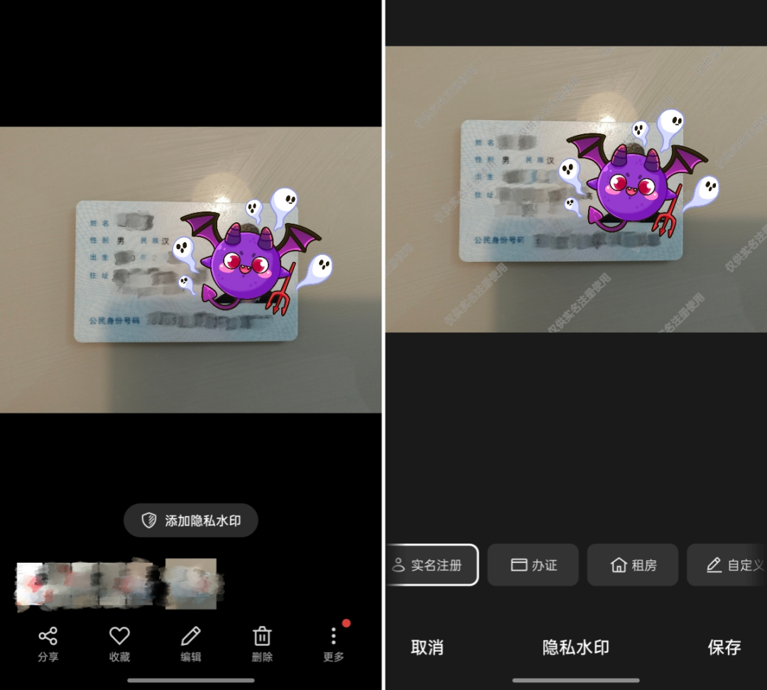 而在识别到证件类图片时,底部会自动出现「添加隐私水印」按钮,并提供了三种预设字样和自定义编辑功能。正如 @喵总 所认为的:日常在签合同、做授权需要提供证件的时候,这个功能真是简单好用又能保护隐私。