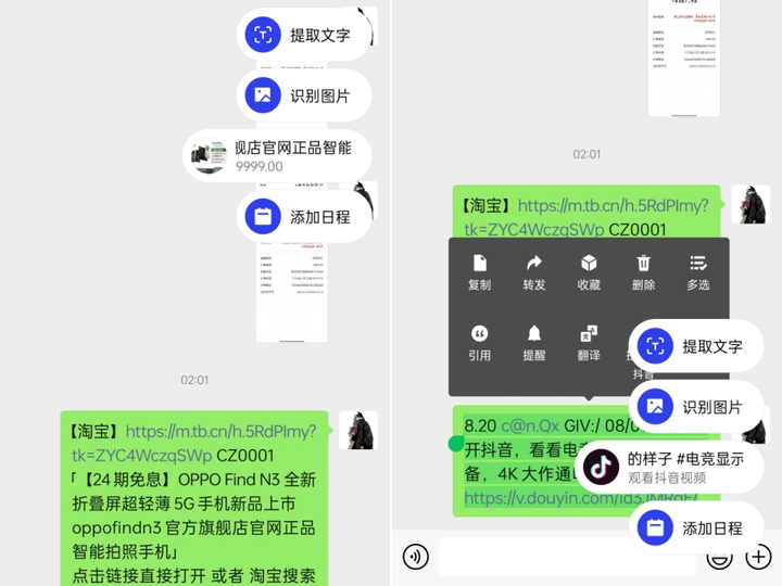 AndesGPT 的能力远不止于此,小布的 AI 创作能力也会持续升级,例如文生图、图生图、音乐创作等能力也会在不久之后陆续掌握。在万物互融的时代,用户需要关注和使用到的信息,时常会以各种格式散落在各个应用之间,互不相通。在面对琐碎内容和散落在各处的信息时,高效的信息提取和整合工具成为提效的关键。从采集、中转到流转,ColorOS 团队找到了众多共性痛点:文字和图片最好一触即采,信息最好能批量采集,自动多端同步,尽量减少重复操作。为此,ColorOS 14 强调「以人为中心」,推出全新的全局融合创作,实现跨应用乃至跨设备的信息流转。应用生态之间也一直都存在着无形的「壁垒」,将购物平台或者其他社交平台分享至微信好友聊天界面时,或许是正常打开的小程序或者卡片,能够正常跳转浏览;也可能是一串长长的链接字符,需要复制下来再去打开对应应用查看。小布识屏也针对这样的窘况作出了优化升级,可以直接识别淘宝和抖音等字串信息,容纳后直接跳转到对应应用页面,的确方便了不少。除了文字可以被识别采集,ColorOS 的「闪速抠图」功能可以识别图像主体,且支持最多 6 个主体单独提取。操作过程也符合直觉,相对简单:在相册内打开想要抠图的图片,长按即可智能识别主体自动抠图,如果是视频,也可以在暂停播放的画面直接长按抠图,可以将抠图后的素材直接保存到相册或是暂存到侧边栏的中转站,整个操作简单又迅速,不过对于复杂画面的识别算法仍有待加强。