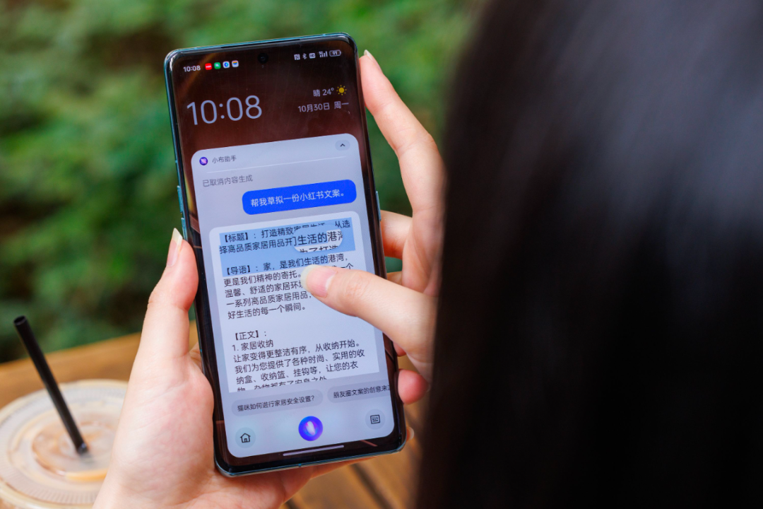 除此之外,@元芳 还会让小布来帮他制定旅游计划,这对于小布而言,不过是小菜一碟:面对长篇文章,基于 AndesGPT,小布也能帮你一键生成精炼摘要,让文章精华一目了然。在进行电话会议或者语音沟通的时候,语音信息可能只能被记录下一些零碎信息,沟通时间一长就很容易错过关键信息,而且也难以回溯整理。对此,ColorOS 14 推出了「通话摘要」的功能,在拨打与接听电话的界面,一键按下通话摘要按钮,系统就能生成完整录音记录,以及关键信息总结与摘要。当然,拥有全新小布的你,也可以让小布替你写好文案,例如适用于小红书博文的文案、朋友圈文案、餐厅点评文案,甚至帮你完成 SWOT 分析、生成策划案、短视频脚本等等。直言自己有着选择困难症的@数懒小姐姐 ,在每次需要艰难抉择的时候,都已经习惯性地会问小布了:例如犹豫不决不知道吃什么的时候就可以问小布,又例如一些常用的合同拟定,特别是摄影工作室常用到的肖像权使用以及版权等等的合同,生成合同后直接分享到中转站或者 PC 端就能立马用起来。