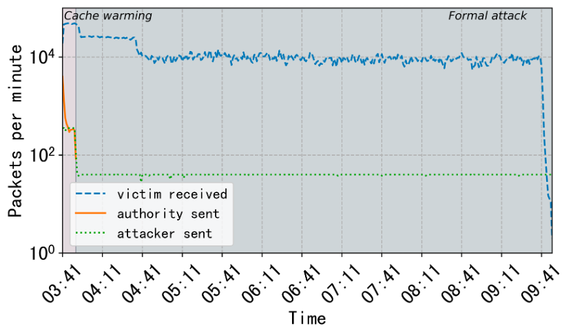 我们组织了可控环境下的小规模现实网络实验,通过调度61个脆弱DRS,组成了一个5层长度的DNSChain。该实验持续了6个小时(如图10所示),在整个实验中,攻击者总共发送了17864个数据包(0.8p/s),而受害者总共收到了4,557,336个请求(206.4p/s)。