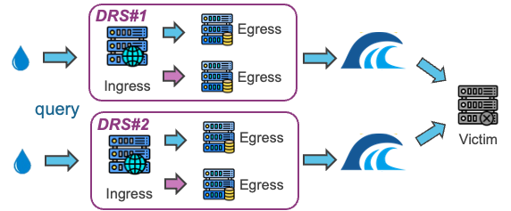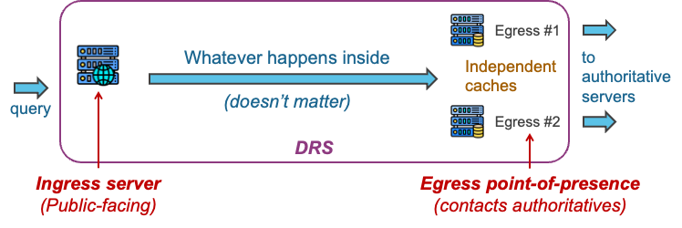 在这条“荔枝道”的入口,你作为尊贵的杨玉环,自然不需要关心荔枝中途经过了哪里,只需要向最近的驿站发出指令即可;在“荔枝道”的出口,荔枝园也只负责提供荔枝,并不关心这份果实要给谁。类似地,尽管域名解析的路径复杂,在外界看来都对应着入口节点(ingress,即最近的转发器“驿站”)和出口节点(egress,即递归服务“荔枝供应点”)。因此,我们将中间过程看作是一个黑盒;在入口节点确定后,将它背后的解析路径中包含的所有服务器,直到出口节点,统称为一个DRS(DNS Resolver System)。一个递归解析器就是一个最小单位的DRS。