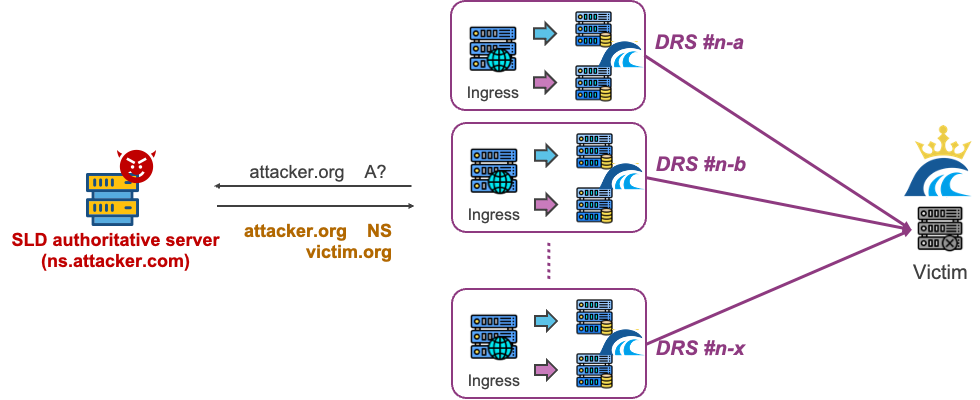 攻击者只需要像图6中那样通过恶意的NS记录,就可以让这些激进的DRS去向受害者发送查询,而不断地重复这个过程,就可以持续对受害者造成压力。