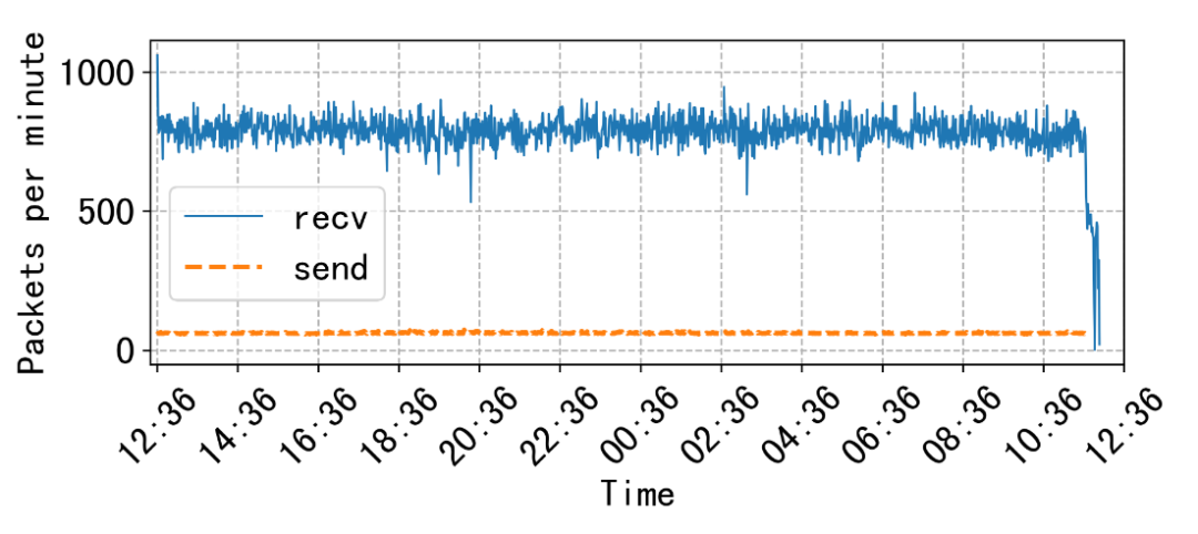 我们组织了可控环境下的小规模现实网络实验,构建了一个7层的环路,并使用我们自己的转发器(DRS#1)作为首尾衔接,以此来观察和控制环路内的流量。我们只在实验开始时通过Layer1的DRS#1 发出了一个DNS的查询请求,这个请求被转发、重复、最终通过最后一层的DRS回到第一层,循环往复。图12是实验过程中我们的转发器的流量情况,可以看到整个实验直到最后人为停止,在24小时之内都一直保持着稳定的转发环路,在这其中我们的转发器总共发送了86,380个数据包(1 p/s,每2个请求为一次新的对外查询),收到了1,100,320个数据包(12.7 p/s),实验期间收到(循环)了43,190次相同的请求。