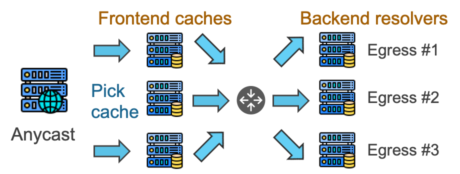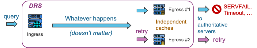 当域名解析因超时等原因失败时,DRS会自然地发起重试,这些重试是流量放大的基础。多数情况下,单台服务器重试的放大能力相对有限。但是,某些提供大规模公共解析的DNS系统结构复杂,特别是多后端架构可能加重流量放大风险:由于每次重试请求可能由不同的后端节点发出(如下图),且不同的后端节点具备独立缓存 [4],无法对同一请求的重试进行统筹处理。