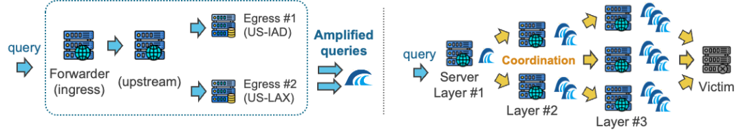 虽然有重试激进的DRS,但大多数的DRS的重试行为并不足以形成威胁。为了实现更大规模的放大攻击,需要借助组合协调的技术让流量实现级联放大,我们称之为DNS链式攻击(DNSChain)。此攻击模型通过级联多层DRS完成,每层都在实现重试放大,并通过攻击者的刻意重定向实现放大倍率的叠加。