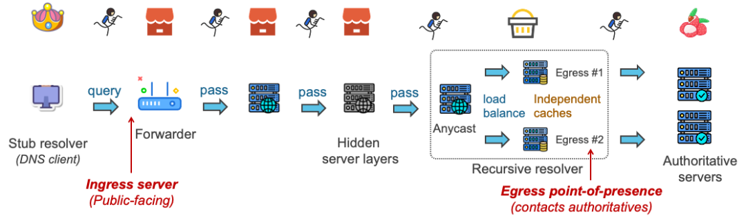 图1展示了一个当下典型的多层次解析结构,包含客户端、转发器(forwarder [3])、递归解析器、以及权威服务器。当你发起一个域名解析请求(想要“吃荔枝”)后,这条消息就从离你最近的转发器(“驿站”)出发,被层层传递给各种公共或隐藏的转发器(其他多个“驿站”)并最终到达某个递归解析器(“荔枝供应点”),由它们在权威服务器(“荔枝园”)中问询后,再原路接力将结果送到到你的手中。