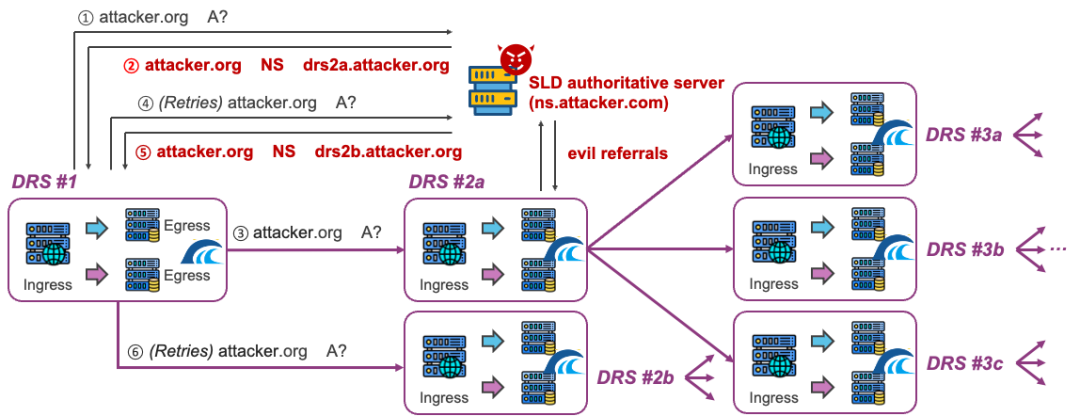 对DNS请求进行重定向的操作,与一款名为King的IP间时延测量工具异曲同工。如下图所示,其基本原理是:攻击者会在自己的权威服务器上动态地构造恶意响应,而这个响应是一条NS记录,致使DRS将请求转发至其他的DRS,不断地重复这个过程,就会有越来越多的DRS参与到解析中被组合在一起导致级联放大。如下图: