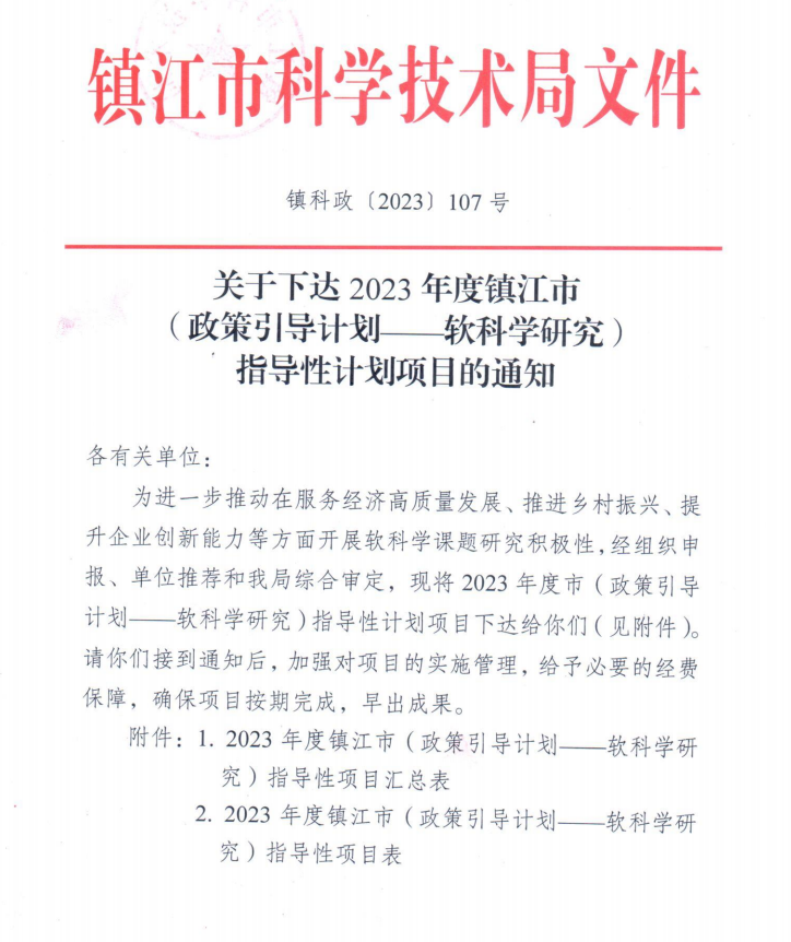喜报!我司获2023年度镇江市(政策引导计划软科学研究)指导性计划项目立项