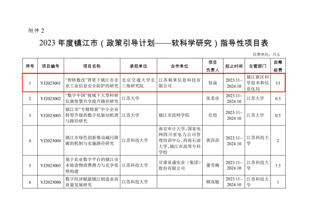 点击星标,即时接收最新推文近日,我司““智转数改”背景下镇江市企业工业信息安全防护的研究”项目获2023年度镇江市(政策引导计划软科学研究)指导性计划项目立项。此次获评是上级主管部门对我司工作的认可。
