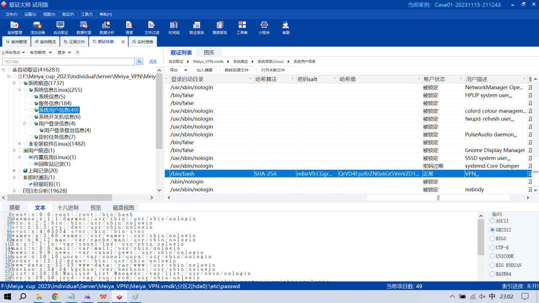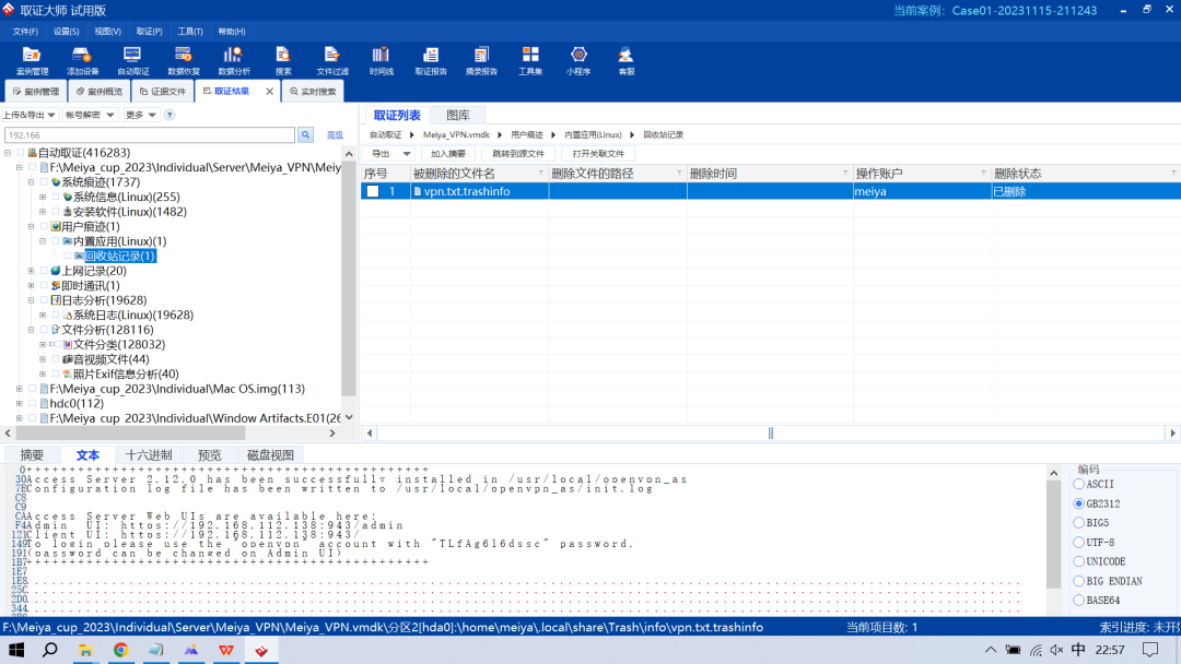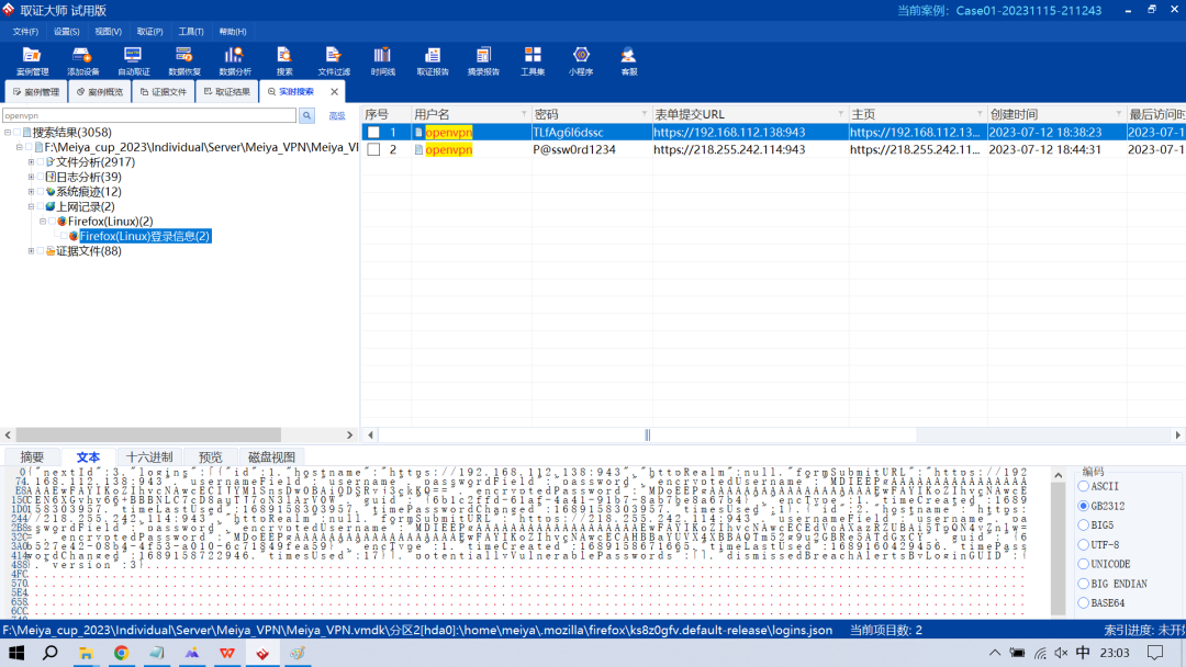 打开虚拟机需要绕密码,避免麻烦,可以直接使用大师加载vpn.vmdk分析搜索即可,说真的美亚杯里大部分题用大师都可以解,而且感觉是最高效的方式。