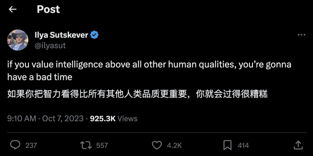 如果你相信这一点,那么就会有很多有趣的含义。如果你有一个非常大的人工神经网络,那么人脑可以做到的事,大型人工神经网络也可以做到。如果你足够认真地对待这种认识,一切都会随之而来,我的大部分工作都可以用这个来解释。Sutskever 在 X 上的一篇帖子,读起来像一卷格言,不过应该能代表他内心对这项技术,最真实的看法:如果你把智力看得比所有其他人类品质更重要,你就会过得很糟糕。