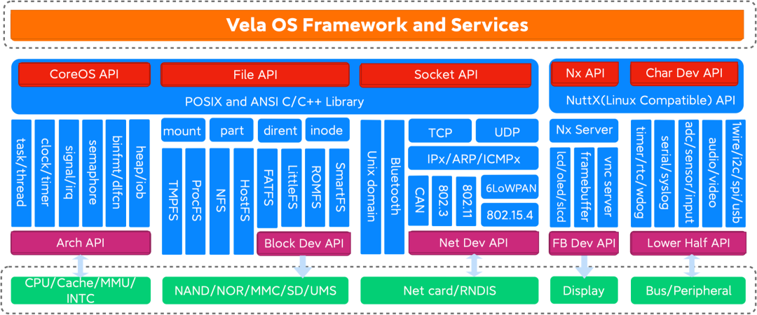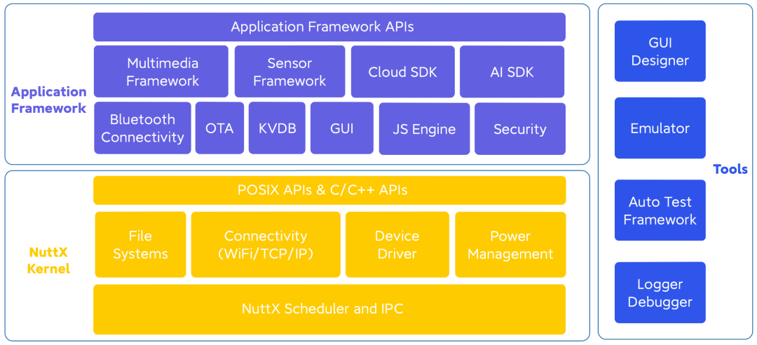 底层 NuttX 内核:提供最基本的任务调度、跨进程间通信、文件系统等基础 OS 功能,同时也提供简洁高效的设备驱动、轻量级的 TCP/IP 协议栈和电源管理等组件。