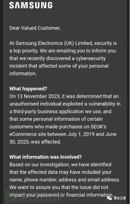 "我们最近接到了一起网络安全事件的报警,该事件导致三星英国电子商店部分客户的某些联系信息被非法获取。银行卡、信用卡信息或客户密码等财务数据均未受到影响。该事件仅限于英国,不影响美国客户、员工或零售商数据。”——三星