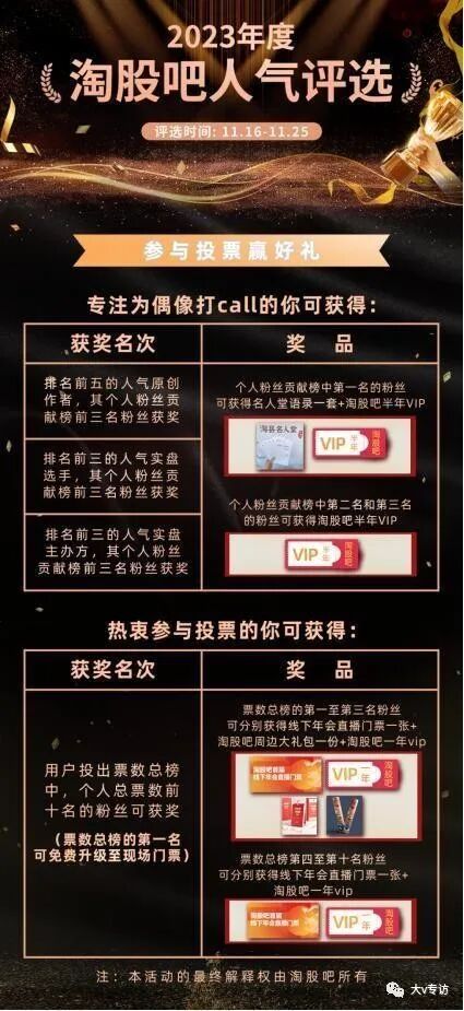 2023年淘股吧人气作者评选开始啦,人气用户将有机会受邀至首届线下年会,幸运粉丝将有机会和喜欢的作者见面!快打开淘股吧App给喜欢的作者提名投票吧!!!