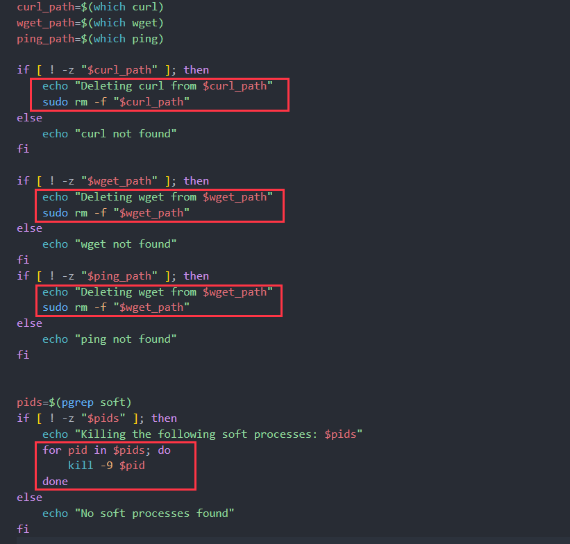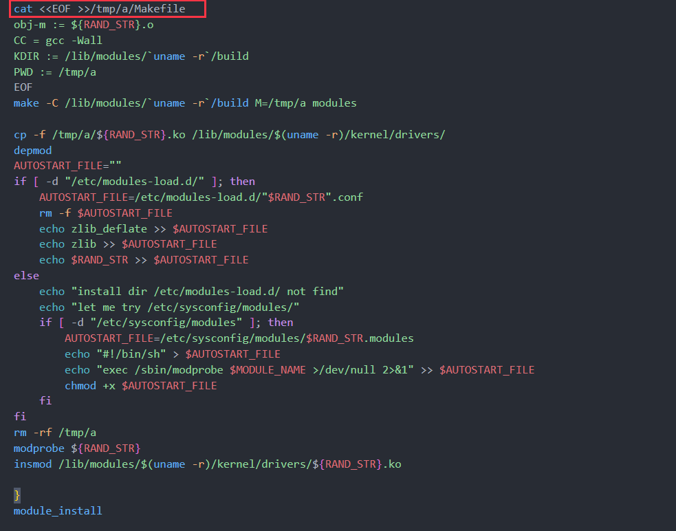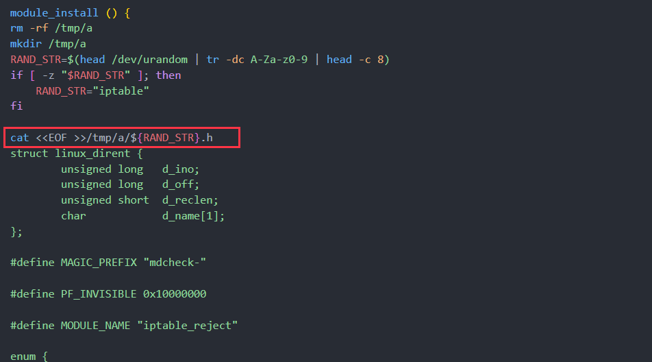 7LvMgjN1~7.xml内容如下,从146.56.217[.]27拉取7LvMgjN2.sh文件并通过bash执行。脚本首先执行如下命令防止Shell记录执行的历史命令。下载elf文件,保存为/var/tmp/7LvMgjN2,然后执行,执行完成立即删除。修改防火墙设置,允许本地回环地址、149.28.237[.]94和内网IP地址的61616端口入站TCP连接。以及修改系统配置。定义module_install函数并执行。该函数首先生成随机字符串,然后在/tmp/a目录下释放该随机字符串命名的.h和.c文件,以及Makefile文件。接着将释放的文件编译得到Linux内核模块,然后安装。脚本最后检查系统中是否有curl, wget和ping命令,如果存在则删除,检查进程列表中是否有有包含soft关键字的进程,如有则kill -9强制结束。脚本安装的内核模块源码来自开源Rootkit项目https://github.com/m0nad/Diamorphine/。攻击者利用ActiveMQ漏洞请求172.245.16[.]125的多个xml文件,分别是win.xml, w.xml, c.xml。