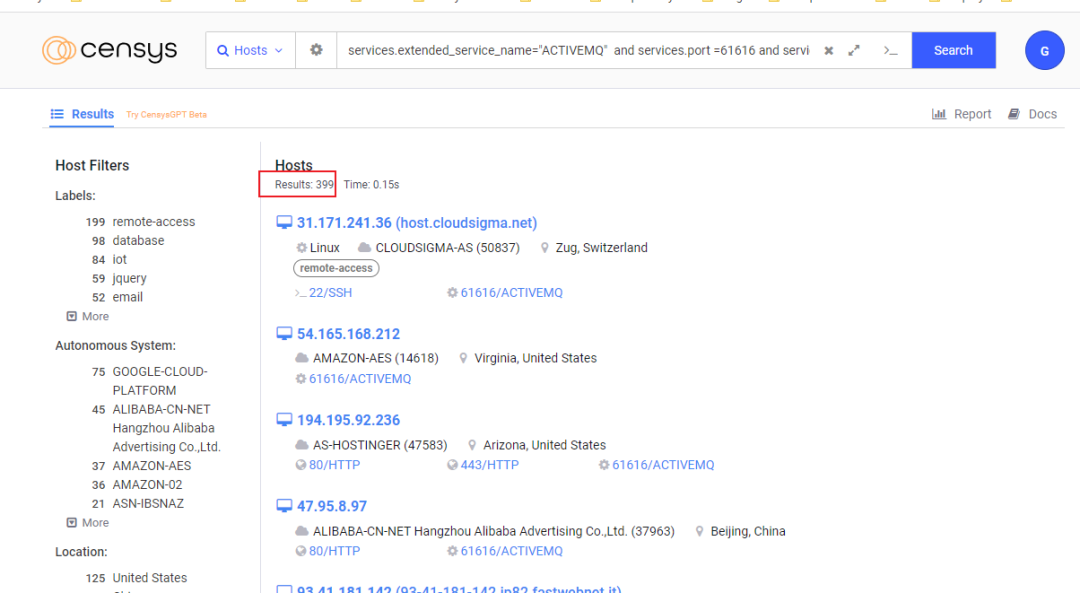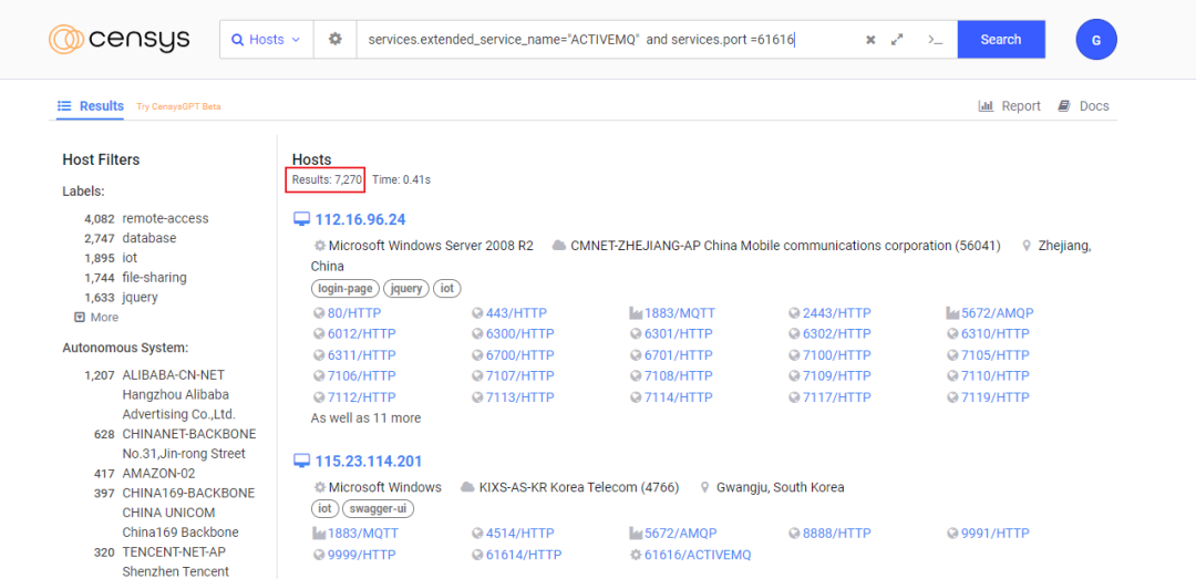 根据攻击者使用的IP地址172.245.16[.]125和勒索信留下的邮箱”service@hellokittycat[.]online”,可以判断此攻击团伙就是Rapid7此前披露的HelloKitty勒索软件团伙[4]。通过Censys平台发现网络空间中开放61616端口的ActiveMQ服务设备共计7270个,而其中不低于漏洞影响版本的ActiveMQ服务设备仅399个,也就是说高达六千余个ActiveMQ服务设备直接受到该漏洞影响。