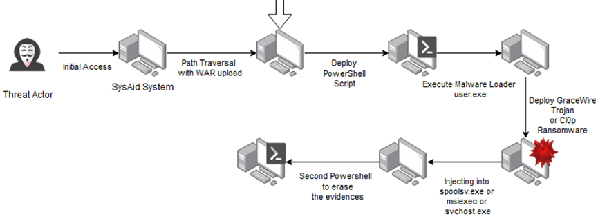 威胁行为者利用 SysAid CVE-2023-47246 路径遍历漏洞,成功将包含 WebShell 和各种有效负载的 WAR 存档上传到 SysAid Tomcat Web 服务的 Webroot 中。利用此漏洞涉及操纵accountID参数以引入路径遍历,从而允许攻击者确定易受攻击的服务器上编写 WebShell 的位置。随后,威胁参与者获得对 WebShell 的访问权限,使他们能够与受感染的系统进行交互。