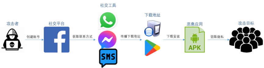 APT-C-52(焰魔蛇)组织主要通过Google Play应用商店传播恶意应用,首先利用Facebook获取攻击目标联系方式,然后通过WhatsApp或短信等社交方式传播恶意应用的下载地址,诱导攻击目标安装并使用恶意应用,实现窃取目标隐私数据等敏感信息的目的。
