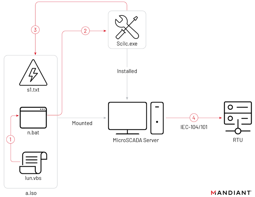 该攻击者首先使用 OT (LotL) 技术来可能触发受害者的变电站断路器,导致意外停电,同时乌克兰各地的关键基础设施遭到大规模导弹袭击。Sandworm 随后在受害者的 IT 环境中部署了 CADDYWIPER 的新变种,从而实施了第二次破坏性事件。据分析,Sandworm 将 ISO 映像文件部署为虚拟机管理程序中的虚拟 CD-ROM,该管理程序托管目标变电站环境的 MicroSCADA 实例。ISO 包含执行“scilc.exe”的文件,这是一个合法的 MicroSCADA 实用程序,可让攻击者运行任意命令。