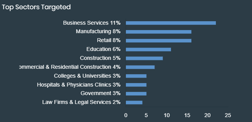 根据通过收集的数据,NoEscape 勒索软件组织已针对多个垂直行业。商业服务受影响最大,其次是制造业和零售业。相关受害者还包括政府组织、医院和医疗诊所。