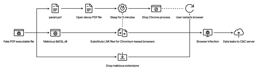 在该活动中,攻击者发送了一份档案,其中包含善意公司的新产品图像以及伪装成 PDF 图标的恶意可执行文件。启动后,恶意软件会打开一个真实的嵌入式 PDF 文件,其中包含作业详细信息。这次攻击是针对寻求职业转变的营销专业人士量身定制的。该恶意软件会安装一个浏览器扩展程序,能够窃取 Facebook 业务和广告帐户,并可能用于后续销售。
