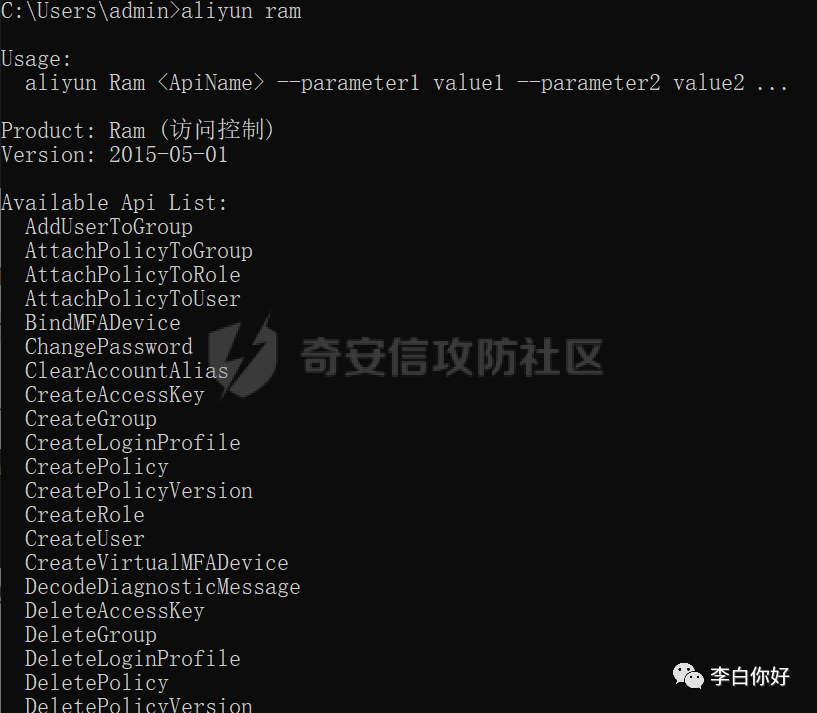 如果命令实在是不好记 可以直接用aliyun ram,会列出当前模块的功能(太多就不截全了)