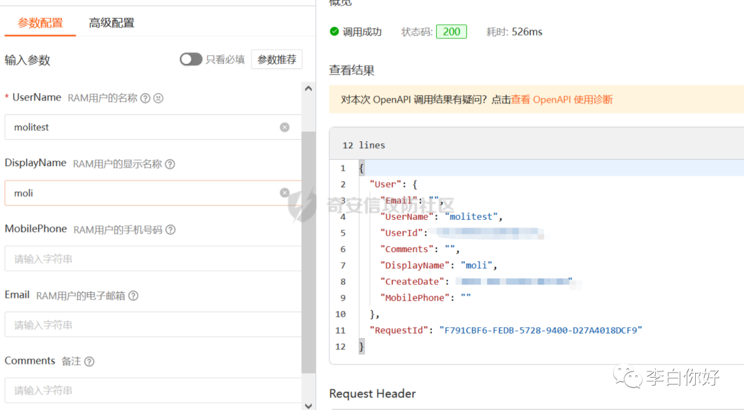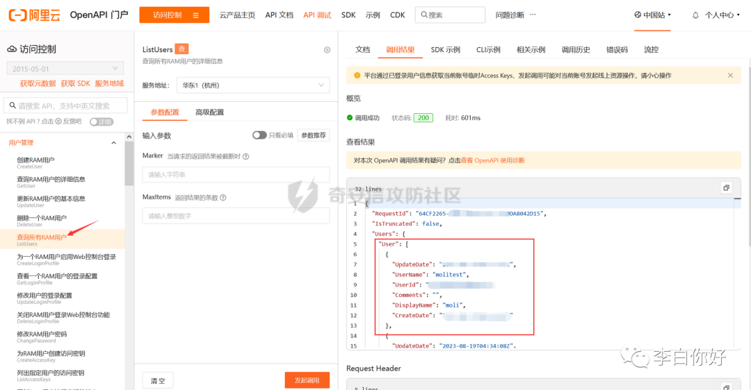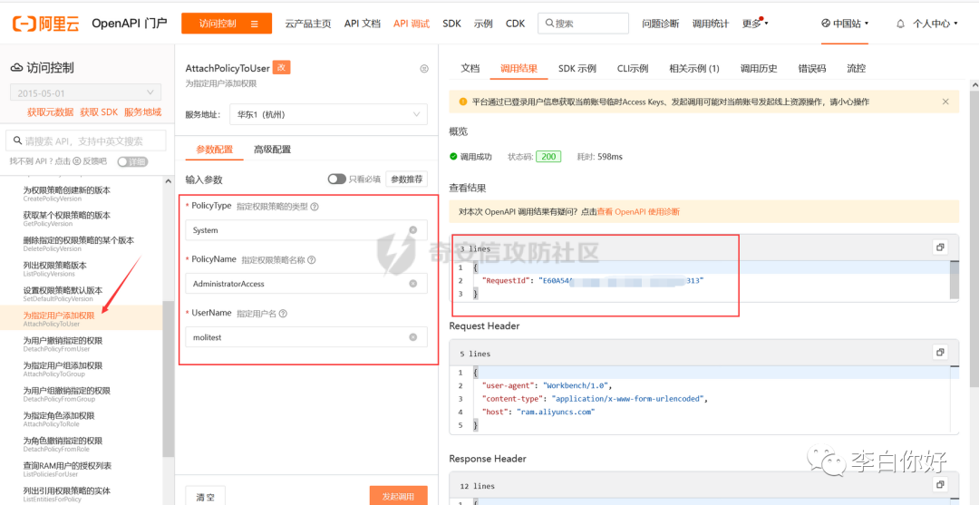 https://next.api.aliyun.com/api/Ram/2015-05-01/CreateUser?spm=api-workbench.API%20Document.0.0.6f991fc66Lk9cV&params={%22UserName%22:%22molitest%22,%22DisplayName%22:%22moli%22}&tab=DEBUG我们在渗透或者是挖洞的过程当中,尽量不要留下痕迹以防止溯源之类的情况出现